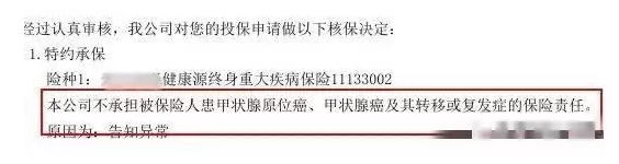這種除外承保的特征是顯而易見的。告訴被保險(xiǎn)人指定豁免疾病責(zé)任是非常明確和直截了當(dāng)?shù)?。例如,上圖規(guī)定被保險(xiǎn)人身患甲狀腺癌就不承擔(dān)相應(yīng)的保險(xiǎn)責(zé)任,但不包括其可能的延期的其他疾病。