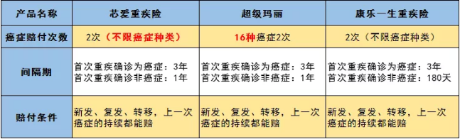 如下,3款產(chǎn)品的癌癥多次賠付對比圖: