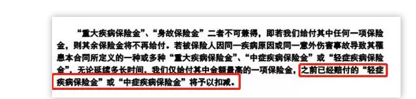 什么意思呢?如果你選擇50萬保額,輕度腦中風(fēng)(輕癥)理賠了15萬保額后,如果腦中風(fēng)惡化成重疾,不好意思,只能賠50-15=35萬保額。