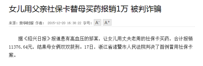 這不是危言聳聽。在2015年,就有新聞報道過,浙江一女子因冒用父親社??ㄌ婺赣H買藥報銷,與母親被雙雙判刑。