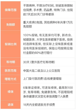 2、6年內(nèi)免賠額共1萬,100種重疾0免賠