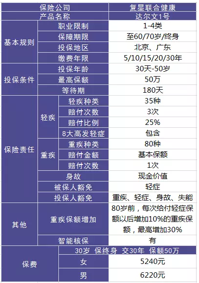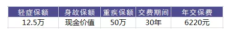 張先生今年30周歲,購買達(dá)爾文1號,重疾保險金額50萬元,輕癥疾病保險金額12.5萬元,交30年,保險期間保至終身,每年繳納保費(fèi)6220元。