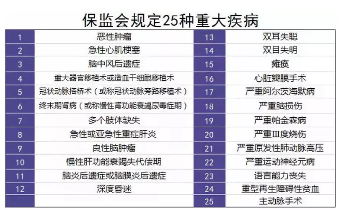 保監(jiān)會制定了25種重大疾病,要求所有重疾險都必須包含它們,并且疾病定義和理賠標(biāo)準(zhǔn)都必須一樣,不準(zhǔn)修改。而這25種重大疾病,已經(jīng)占了所有重疾理賠的95%以上。