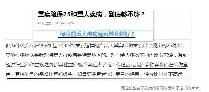 更別說這位業(yè)務員自己公司的公眾號也曾發(fā)文稱:25種重大疾病就夠了。這些業(yè)務員朋友為了出單,連自己公司說的話都不認了啊!