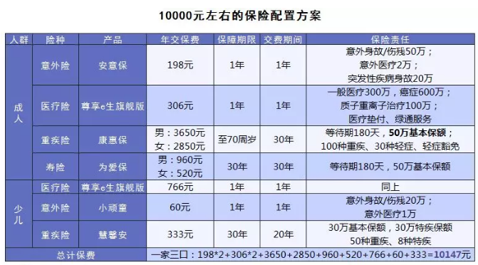 1)10000左右的話,盡可能把重疾保額做高,同時為孩子購置保險。