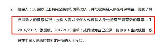 “投保人需以投保人或被保人身份持有當(dāng)前有效的尊享e生2016/2017、旗艦版、2017PLUS保單;或同時(shí)為自己投保一份尊享e生旗艦版”