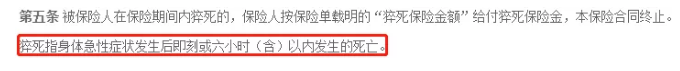 條款規(guī)定,只要在6個小時內(nèi)發(fā)生的死亡都可以作為猝死來賠付。