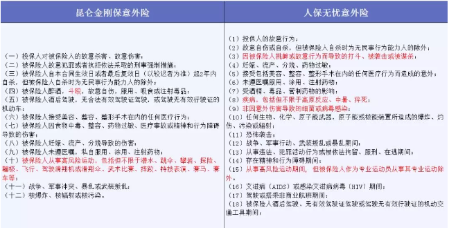 高風(fēng)險(xiǎn)運(yùn)動(dòng):人保無憂指明專業(yè)運(yùn)動(dòng)員或從事專業(yè)運(yùn)動(dòng)的除外,但沒有舉例一些常見的高風(fēng)險(xiǎn)運(yùn)動(dòng)名稱。昆侖金剛列舉了十幾個(gè)高風(fēng)險(xiǎn)運(yùn)動(dòng),但沒有將專業(yè)運(yùn)動(dòng)員排除在外,這一點(diǎn)兩款產(chǎn)品不相上下。