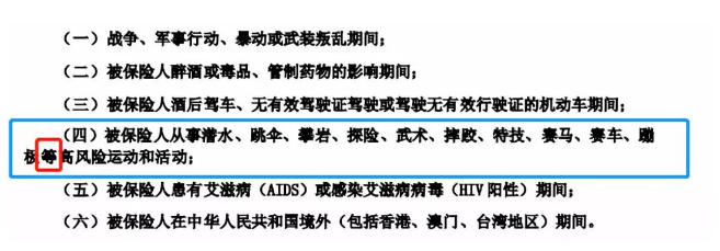 這是一條關(guān)于高風(fēng)險(xiǎn)運(yùn)動(dòng)的免責(zé),保魚君看過很多意外險(xiǎn)的保險(xiǎn)免責(zé)條款了,但對(duì)于“等”字都沒有一個(gè)明確的界定。
