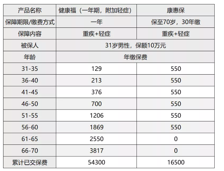 現(xiàn)在來(lái)看看直觀的對(duì)比,以下是健康福(一年期)和百年康惠保年繳保費(fèi)對(duì)比: