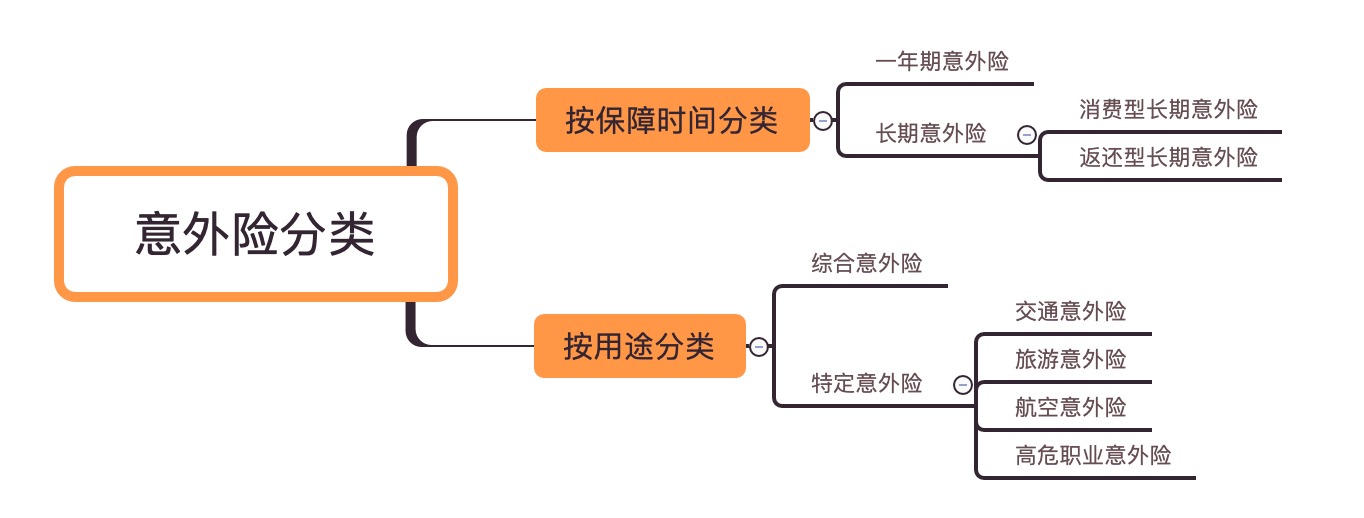 雖然意外險(xiǎn)相比健康險(xiǎn)不算復(fù)雜,但是意外險(xiǎn)種類繁多,下圖從保障期限和用途對(duì)意外險(xiǎn)做了簡單分類: