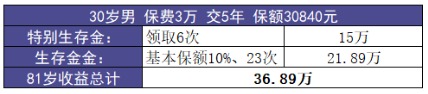 交了15萬,81歲時收益為36.89萬,純收益為21.89萬。