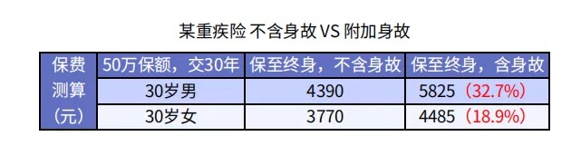 你看,30歲男性50萬保額,交30年保至終身,附加身故責任后保費貴了32.7%。