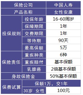 女性安康是一款團(tuán)體險(xiǎn),只針對女性特定疾病有保障,乳腺癌雙倍賠付,保障的內(nèi)容比較少,保額也不是很高,保險(xiǎn)期為一年,續(xù)保需要審核。