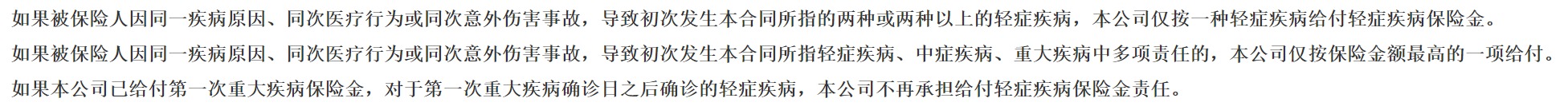 但是它也只限定在同一責任項里只賠一次。如果是先確診輕癥,后來確診重疾,哪怕是同一病因,也會正常理賠的。
