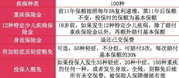 2、如果保險合同中是特定子女,則賠付金額是重疾保險金+基本保額,也就是說,如果小明在第11年得到特定類型的兒童疾病中,你可以獲得814,000加500,000,總共131.4萬賠付~