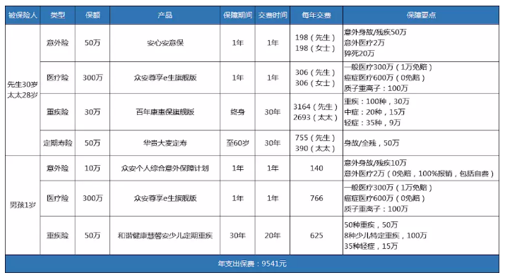 整個(gè)方案保障全覆蓋,每年保費(fèi)支出為:9541元,占年收入的9.5%,兩對(duì)夫婦收到保障如下: