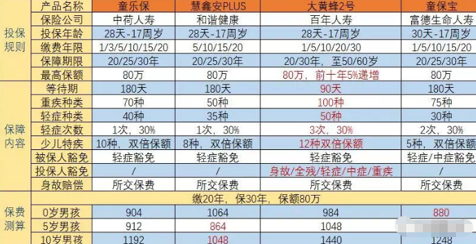 2、如果你考慮保障全面,你要做高保額,童保寶和大黃蜂2號更有優(yōu)勢,尤其是大黃蜂2號,可選保障周期更富,保額仍然可以上升。