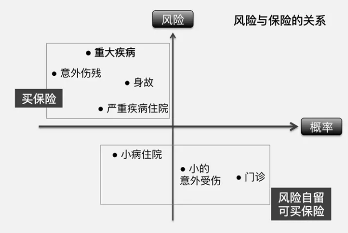 如果我們將日常生活中面臨的風(fēng)險(xiǎn)分為:重大風(fēng)險(xiǎn)和中低風(fēng)險(xiǎn)。然后,不同的風(fēng)險(xiǎn),對(duì)我們?cè)斐傻挠绊懀枰ㄟ^(guò)保險(xiǎn)轉(zhuǎn)移的風(fēng)險(xiǎn)以及可以支付的成本可能會(huì)有很大差異。