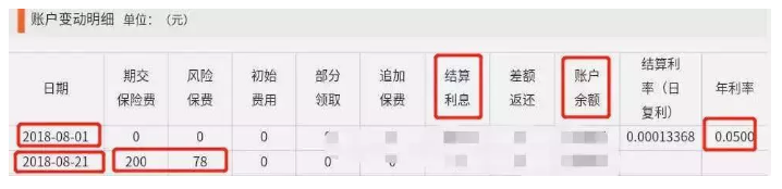 每月21日扣除保費(fèi)200元,其中 78元風(fēng)險(xiǎn)為保費(fèi),另一個(gè)進(jìn)入萬(wàn)能賬戶余額,月利率于1日結(jié)算。實(shí)際結(jié)算年化利率為5%;