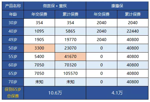 如圖所示,微醫(yī)療保險重疾的保費逐年增加。幾十年來,總的保費比康惠保貴得多。這是自然費率和均衡費率之間的差異。因此,我們不能簡單地認(rèn)為一年產(chǎn)品便宜,還要結(jié)合長遠(yuǎn)的保障時間來看。