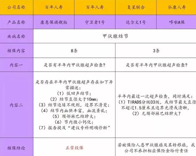 同一疾病公司的核保結(jié)論和核保的內(nèi)容也不一樣。下面我發(fā)現(xiàn)目前市場(chǎng)上出售的一些良好的健康風(fēng)險(xiǎn),以“甲狀腺結(jié)節(jié)”為例。要看誰的智能核保是最放松的。