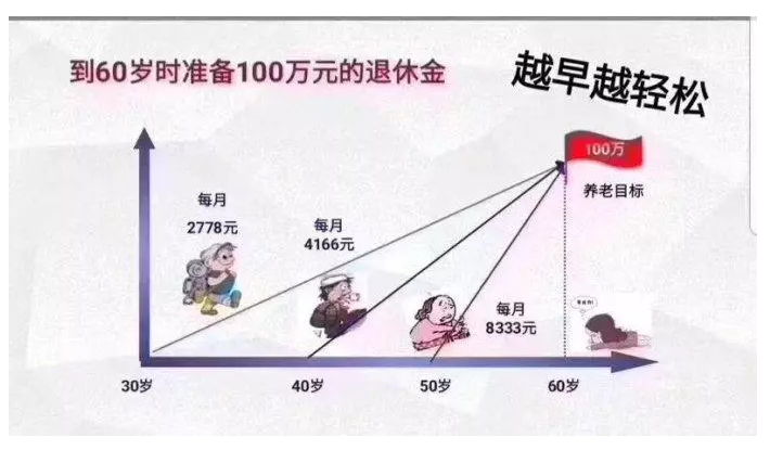 如上圖所示,養(yǎng)老金準備越早越好。越早準備,你需要的本金總額就越少。這是時間復(fù)利的結(jié)果。