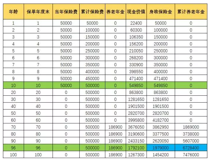 30歲安母親給她的兒子剛剛滿月安 小寶,投保天安生活故事福尊享,選擇10年支付,一年支付5萬元,總付費50萬元,選擇60歲領(lǐng)取養(yǎng)老金年金,基本保險金額18.69萬元,保險期限為終身。然后安 小寶從60歲開始,你可以每年領(lǐng)取186,900元作為家庭養(yǎng)老金補助,直至終身。假設(shè)安 小寶 96歲死亡,共收到36個養(yǎng)老金年金,共計678.44萬元,并給家人留下了179萬元。