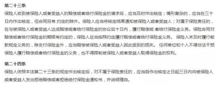換句話說:保險公司申請我們的理賠,即使情況比較復雜,理賠批準也不能超過這個截止日期的30天;即使它不在理賠范圍內(nèi),也必須在3天內(nèi)通知我們!