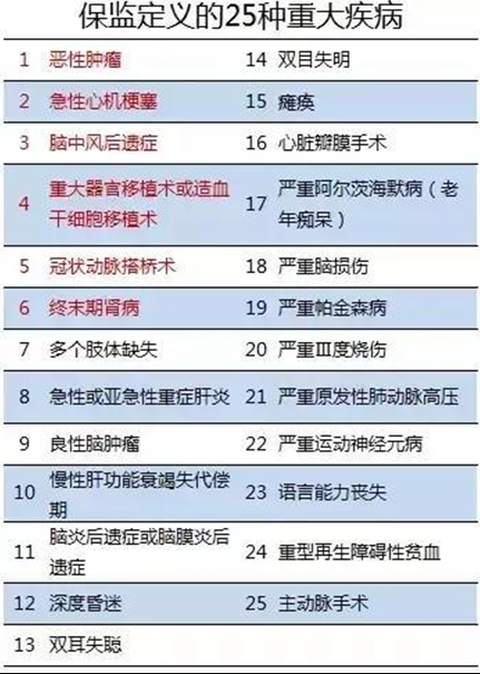 2007年,中國頒布并實(shí)施了由中國保險(xiǎn)行業(yè)協(xié)會(huì)和中國醫(yī)師協(xié)會(huì)聯(lián)合開發(fā)的《重大疾病保險(xiǎn)的疾病定義使用規(guī)范》。任何保險(xiǎn)公司的重大疾病產(chǎn)品必須涵蓋標(biāo)準(zhǔn)、疾病狀態(tài)或手術(shù)的疾病范圍。