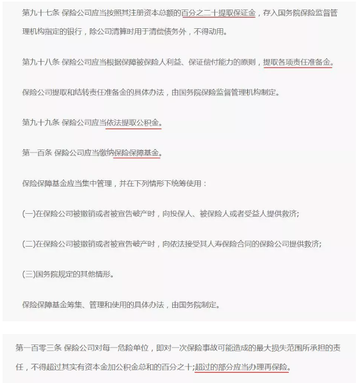 《保險法》第97,98,99,100和103條對應于:保證金制度,責任準備金制度,公積金制度,保險保障基金制度和再保險制度,其中每一個都是有保險。該公司的安全性提供了可靠的保障。