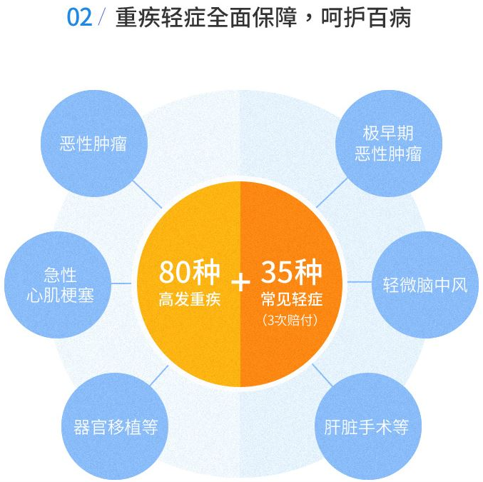 2.輕癥3次未分組,保險金額可以達(dá)到75%,輕癥最多可以支付3次,每次可以支付25%的重大疾病保險金額,并包含5種類型的輕癥