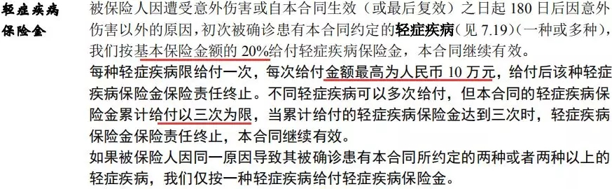 輕癥:30種,賠付3次,賠付20%基本保險金額