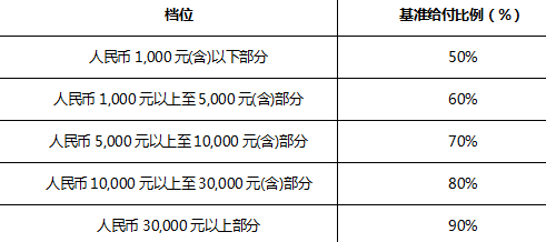 3、住院治療:每次事故100元,基準(zhǔn)支付比例如下:(如果住院費(fèi)通過(guò)社會(huì)保障或其他商業(yè)醫(yī)療報(bào)銷(xiāo)已達(dá)到70%以上,其余部分可能無(wú)法按照分級(jí)累進(jìn)階梯給付,扣除免賠額后支付100%比例。)