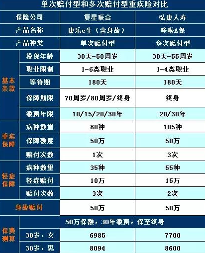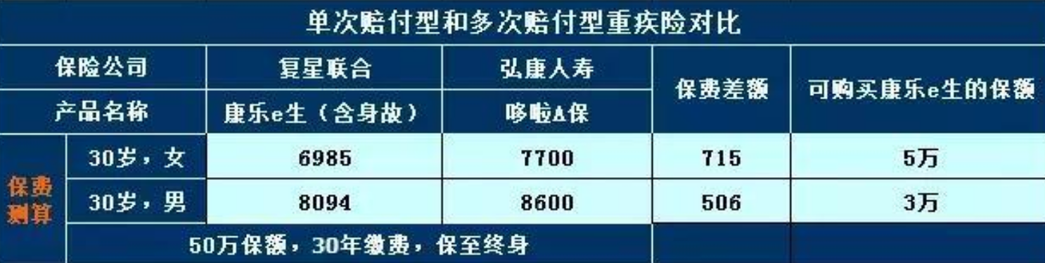 首先,我們比較一下。單個賠付嚴(yán)重疾病以復(fù)星聯(lián)合康樂e生為例子,多次賠付嚴(yán)重疾病是弘康哆啦A保為例。讓我們對比一下,看看兩種產(chǎn)品之間的區(qū)別。