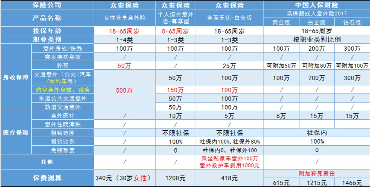 眾安全面無憂白金版的保證金額為100萬。因此,多保魚在市場上選擇了幾款百萬意外險,與全面無憂的白金版本進行了橫向比較: