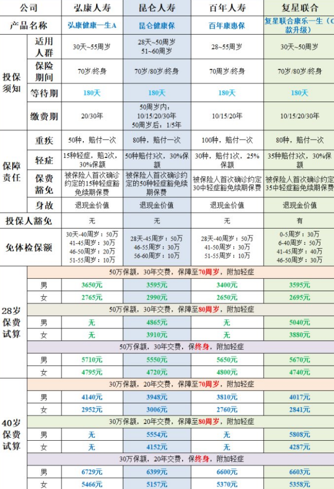 1、從保險年齡開始,50歲以內(nèi)的四種產(chǎn)品都可以投保,51至55歲,雖然昆侖健康保也可以投保,但是保險金額只有躉交或5年交,保險金額更高但支付壓力很大。此時,您可以選擇百年康惠保和弘康健康一生A。