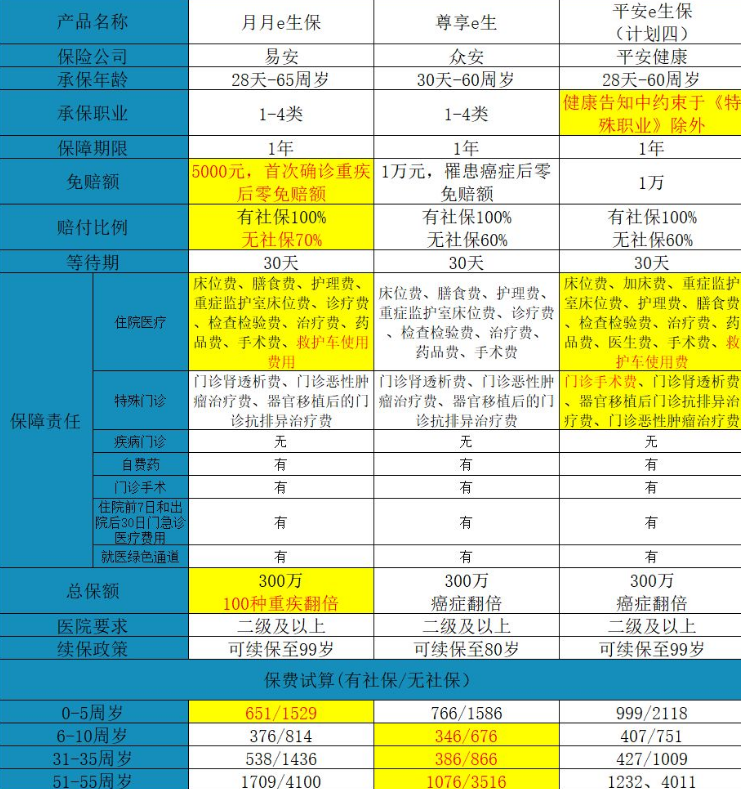 這三種的總保險(xiǎn)金額是杠桿,基本保險(xiǎn)金額為300萬,但最大保險(xiǎn)金額不同。月月e保是100種主要疾病,保險(xiǎn)金額增加一倍并支付;尊享e生和平安e生保只是愛張翻倍,而保障之間的差異仍然完全不同。