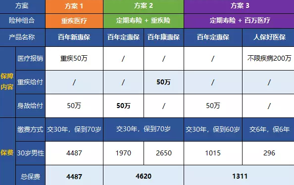 方案2:只要它是重疾,它一次可以賠付50 萬(wàn),身故可再賠 50 萬(wàn)。相比之下,方案2的保障更全面,但保費(fèi)會(huì)更貴一些。