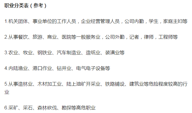 保險(xiǎn)公司將職業(yè)危害程度被保險(xiǎn)人分為6級(jí),將風(fēng)險(xiǎn)從1類(lèi)增加到6類(lèi),1-3類(lèi)職業(yè)是低風(fēng)險(xiǎn)職業(yè),大多數(shù)意外險(xiǎn)產(chǎn)品可以承保。需要注意的是,如果被保險(xiǎn)人的占用發(fā)生變化,應(yīng)在約定的日期內(nèi)通知保險(xiǎn)公司,否則可能會(huì)影響理賠。具體的職業(yè)分類(lèi)因公司而異。以下是職業(yè)分類(lèi)的參考。