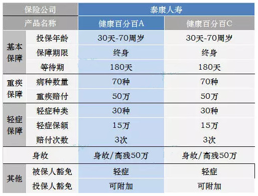 健康百分百是泰康人壽重大疾病保險(xiǎn)中的重點(diǎn)產(chǎn)品,有A、B、C三款,對于A和C款,多保魚做了詳細(xì)的比較,發(fā)現(xiàn):