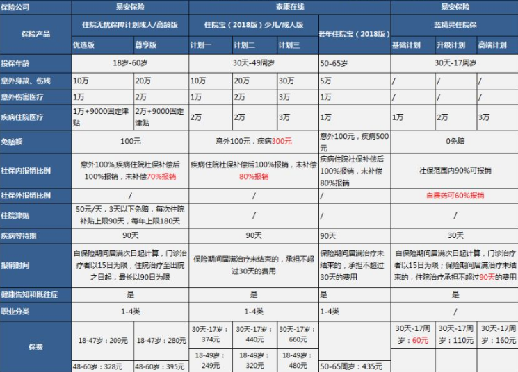 目前,線上有幾種小型醫(yī)療保險(xiǎn)相對高質(zhì)量。他們分別是:易安住院無憂保障計(jì)劃、 泰康在線住院寶、 易安藍(lán)精靈住院保。對比圖如下: