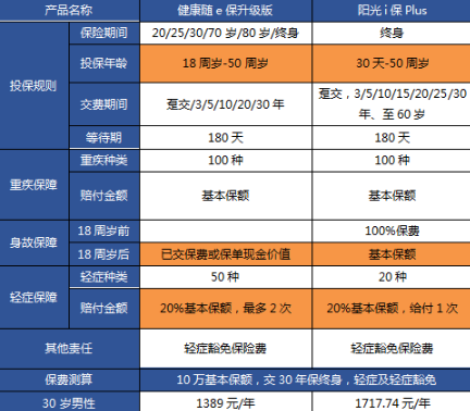 2.投保年齡:健康隨e保升級版,升級的重點是嚴(yán)重疾病的類型和輕癥賠付,但暫時只升級到成人版,所以保險年齡是18歲 - 50歲。陽光i保險是30至50周齡,30天至17歲可保到50萬,全部201個城市。
