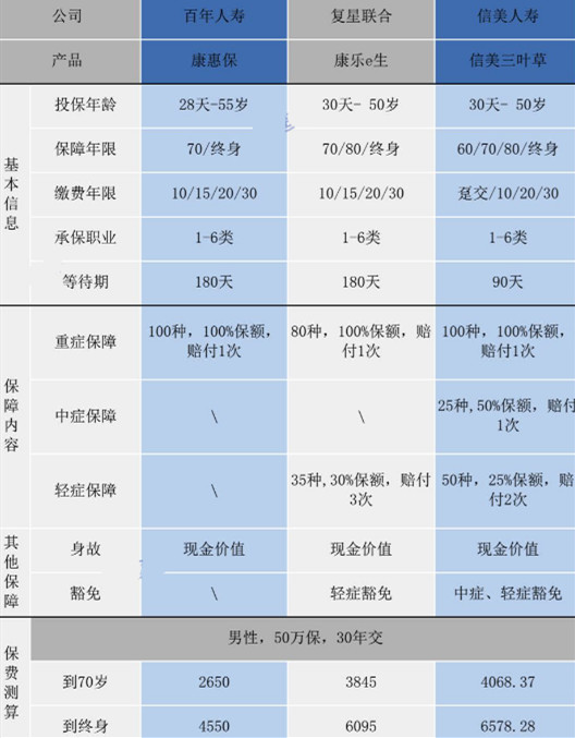 下面我們簡要介紹三款嚴(yán)重疾病的產(chǎn)品,包括:只保重癥疾病的百年康惠保重大疾病保險;保障重大疾病和輕癥的復(fù)星聯(lián)合康樂e生重疾險C款;保障輕癥、中癥和重癥信美三葉草。