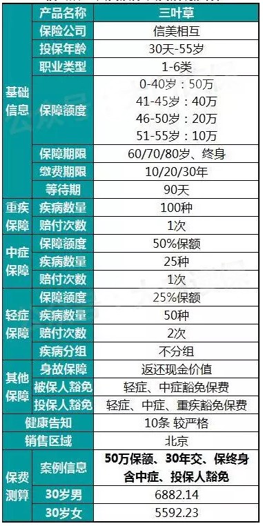 與舊版本康惠保相比,三葉草增加了中癥保障,輕癥賠付也從1次變?yōu)?次,整體保障增強(qiáng)了不少,但價格并不貴得多,特別是30歲女性,500,000保額、30年交,、保證到70歲,三葉草比每年比康惠保貴8元,這是非常劃算的。