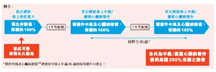 就首次因嚴(yán)重程度2或3之危疾已付或應(yīng)付生存賠償后,第一次從診斷日期開始的基本計(jì)劃的保費(fèi)將永久為豁免,并且被保險(xiǎn)人可以免費(fèi)享受保障至保單終止。