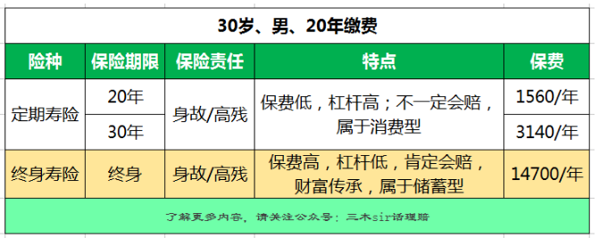 3、終身類型重大疾病保險具有死亡責(zé)任具有壽險功能,通常死亡保額不高,可以結(jié)合一個定期壽險,做足保額,定期壽險杠桿高、保費(fèi)便宜。