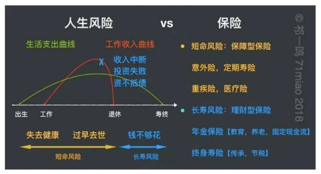 上圖中的紅線是我們的收入曲線,生活費(fèi)用、兒童的教育取決于它。如果我們因退休前意外、疾病而失去健康甚至生命,我們將這些視為短命風(fēng)險(xiǎn)。