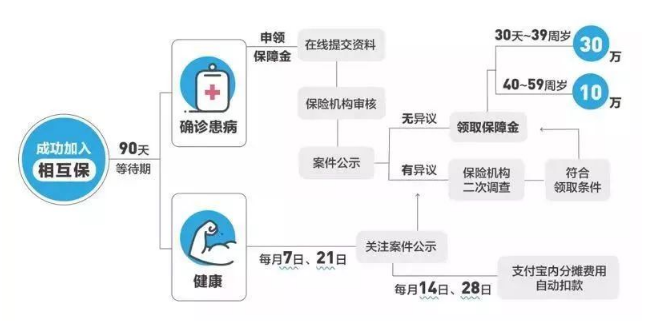 可以看出,根據(jù)“相互保”保險(xiǎn)規(guī)則,用戶從30天到39歲,保障配額為30萬(wàn); 40至59歲的用戶只有100,000保障額度。