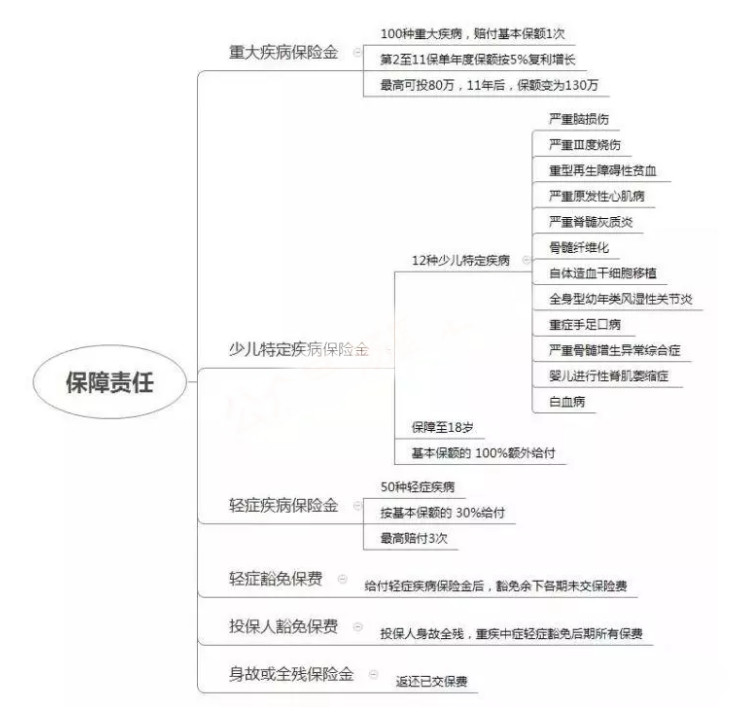 “大黃蜂2號(hào)”保障的責(zé)任非常全面,包括重大疾病、兒童的特定疾病、輕癥疾病、輕癥豁免、保單持有人豁免和死亡全部禁用保障責(zé)任。